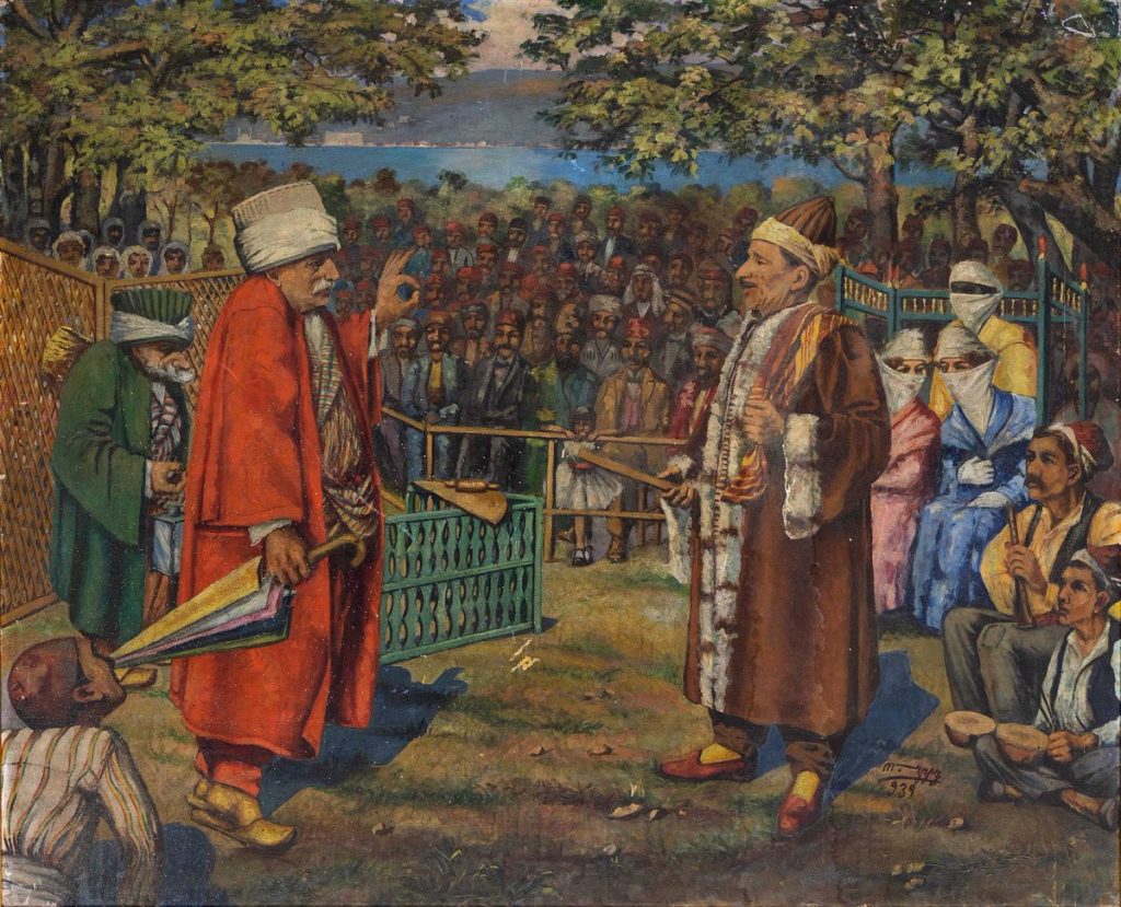 Karagöz ve Hacivat, iki boyutlu tasvirlerin “Hayali”, “Kurgusal” veya “Karagözcü” olarak adlandırılan bir sanatçı tarafından bir perdenin arkasında oynatıldığı Türk gölge oyunudur. Haklarında birçok rivayet olmasına karşın, Karagöz ve Hacivat’ın yaşayıp yaşamadığı, yaşadıysa nerede veya nasıl yaşadığı, oyunun ortaya nasıl çıktığı kesin olarak bilinmemektedir. Bir görüşe göre Mısır’ın fethi sonrası Mısır’da gölge oyununu gören Yavuz Sultan Selim’in bunu İstanbul’a getirdiğidir. Bir diğer görüş ise, 15.yy’da II. Bayezid döneminde İspanya’daki Hristiyan zulmünden kaçıp Osmanlı topraklarına yerleşen Seferad Yahudilerinin İspanya ve Portekiz’den gölge oyununu getirdiğidir. Karagöz ve Hacivat, zamanla divan ve halk edebiyatı, sanat ve halk müziği ve Türk mizah anlayışından beslenerek her yönüyle Türk halk kültürünün aynası olmuştur [1]. Oyun, Karagöz ve Hacivat’a ek olarak imparatorluğun farklı etnik, dini ve sosyal sınıflarının klişe ve kalıp özelliklerini temsil eden Laz, Rumelili, Kayserili, Muhacir, Arnavut, Kürt, Arap, Acem, Yahudi, Rum ve Kekeme gibi birçok karaktere ev sahipliği yaparak oynandığı dönemlerin toplumsal nabzını tutmuştur. Eğitim görmemiş, cahil ve genelde işleri yolunda gitmeyen ama dürüst bir halk adamı olarak yansıtılan Karagöz karakteri ile kurnaz, eğitimli ve düzgün konuşmasını bilen bir “İstanbul Çelebisi” olan Hacivat karakteri arasındaki anlaşmazlıklar ve çatışmalar oyunun ana mizah kaynağı olmuştur. Şeyh Küşteri’yi oyunu yaratan kişi olarak gören Karagöz oynatıcıları oyunun perdesine “Küşteri Meydanı” demişlerdir. Oyun Mukaddime, muhavere, fasıl ve bitiş olarak dört bölümden oluşur. Mukaddimede Hacivat’ın semai/perde gazeli okuyarak Karagöz’ü çağırır ve kısa bir atışma olur. Muhaverede Hacivat ve Karagöz bir konu hakkında konuşurlar. Fasıl oyunun asıl kısmı olup, bu kısımda hikaye gelişirken yan karakterler de oyuna dahil olur. Bitiş bölümü kısa olup “Yıktın perdeyi eyledin viran, varayım sahibine haber vereyim heman” ve benzeri repliklerle oyunun bittiği vurgulanır ve müzikle kapanış yapılır. Karagöz oyunu kendine has bir musiki geliştirmiştir. IV. Murad (1623-1640), III. Selim (1789-1807) ve II. Mahmud (1808-1839) gibi padişahların sarayda perde kurdurup Karagöz oyunu oynatmaları, bu oyunun halktan saraya her kesimin ilgi odağı olduğunu göstermektedir. Karagöz oynatıcılığı, zamanla kendi esnaf loncasına bile sahip olan bir meslek dalı olmuştur. Bu mesleği yapmak isteyen sanatkarlar bu loncalarda aldıkları eğitim sonucu ustalarından icazet almayı başarırlarsa kendi perdelerini kurmaya hak kazanmışlardır.